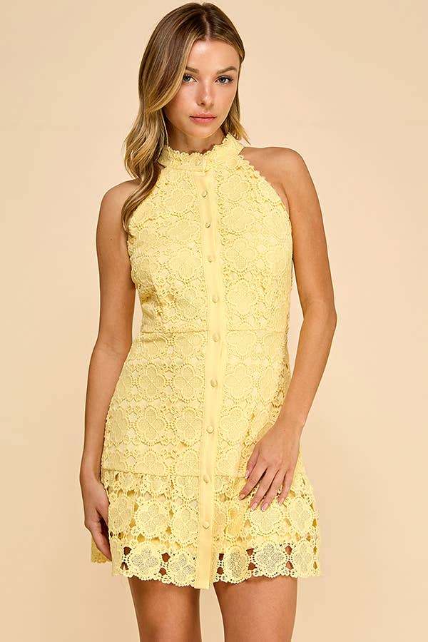 Floral high neck mini dress with ruffled bottom - Fully lined - Scalloped lace band collar - Sleeveless, cut-in shoulders - Front button placket - Seamed waist - Fit-and-flare silhouette - Allover lace Turn heads in the Roseate Floral Mini Dress in Blue—a stunning piece that combines soft romance with modern flair. This mini party dress is crafted from intricate floral lace, offering a beautiful dimension and a touch of whimsy in every detail. Model Measurements Height 5' 7" Bust 32" Waist 25.5" Hips 35.5" The model is wearing a size Small.